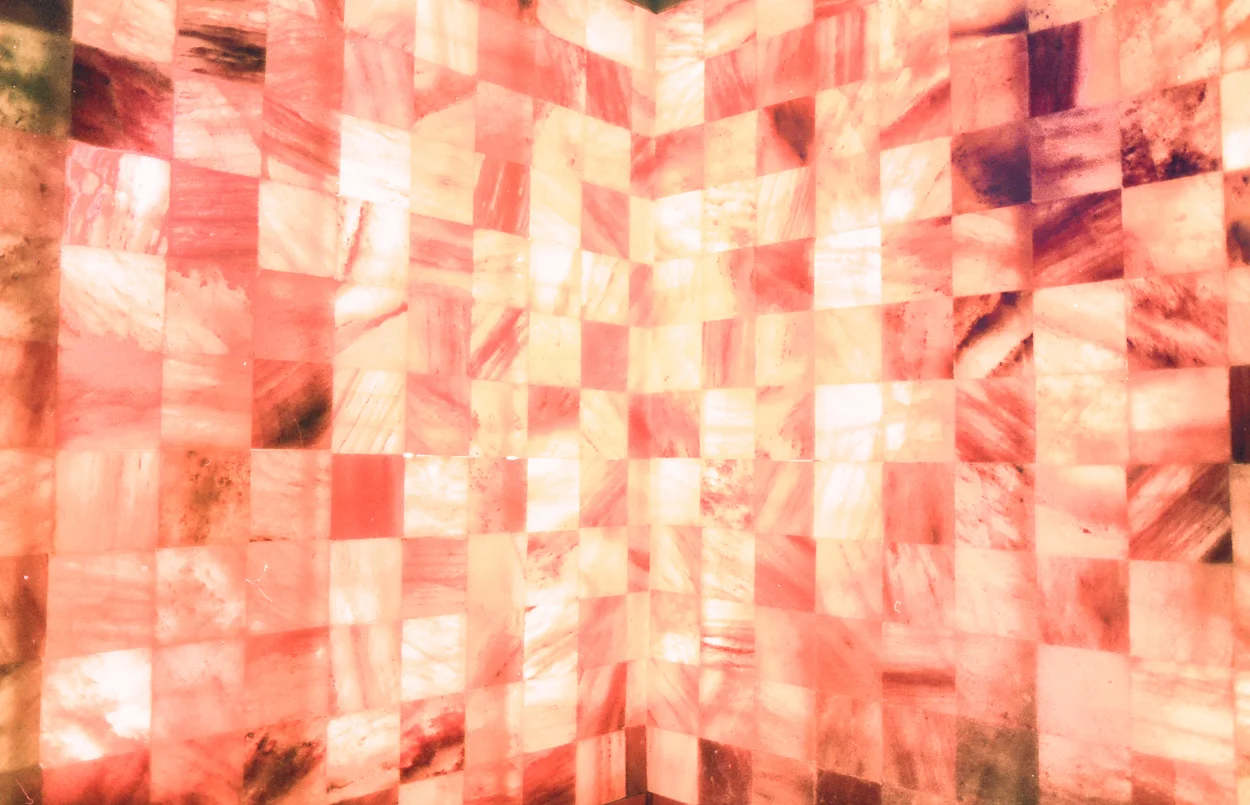The entire wall is covered with tiles of the stuff, and these are lit with hot incandescent bulbs, which are soothingly different from the new, blue and altogether too cool LED ones. The incandescent heat causes the salt to evanesce.
